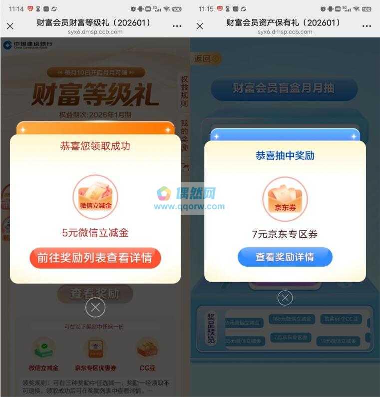 建行财富会员领5-188元微信立减金、7元京东专区优惠券